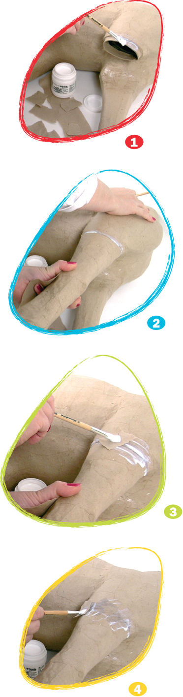 ペーパーパッチ(のり)を塗ります。のりは薄めず使います。紙を貼りたい場所にブラシを使って、ちぎった紙1枚分より少し広めにのりを塗ります。