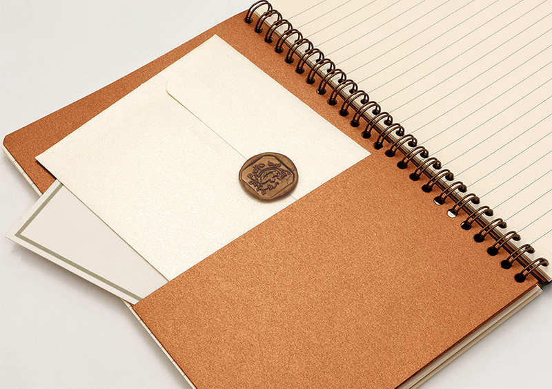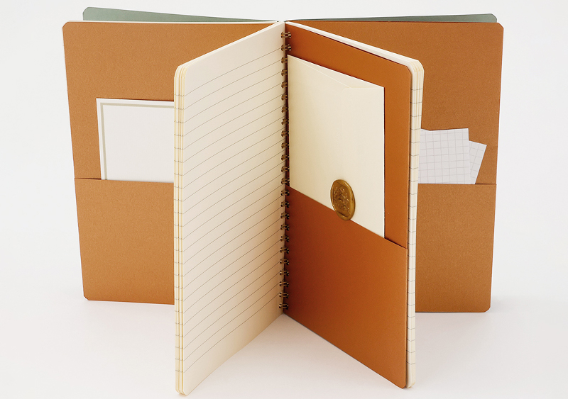 セージグリーンのカラーペーパーにカッパーブラウンの繊細なデザインを組み合わせた大人な雰囲気のノート。