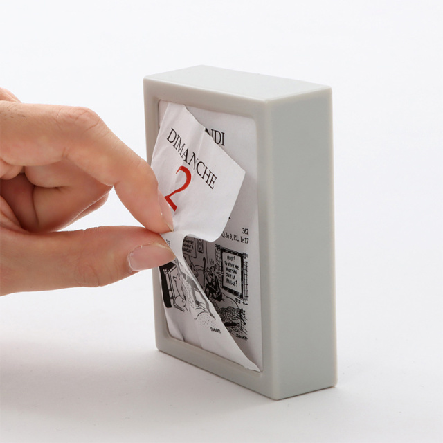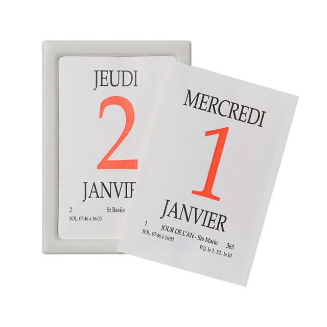 毎日1枚ずつ摘まみ出して使用します。内側にはバネがついており、紙が少なくなっても前に押し出されるようになっています。上から曜日、日付、月が書かれており、全てフランス語表記です。