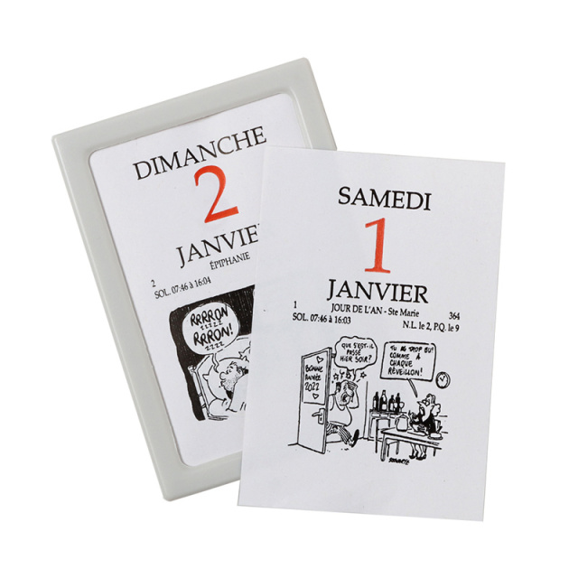 コミック入りは何度もうっかり買いそびれてしまいましたので今回は早めに購入しました。フランス語で日めくり、イラストが入っているのでただ日を見るだけでなく絵までじっくり堪能。コンパクトでどこにでも置けます
