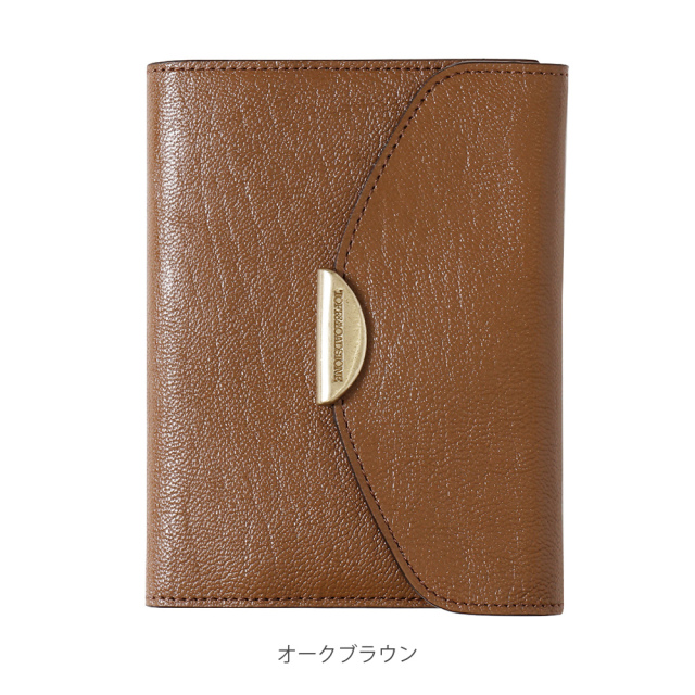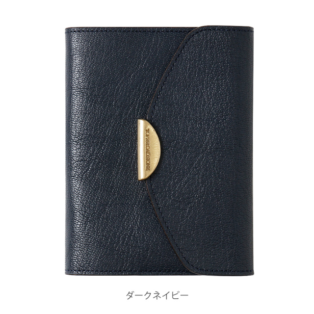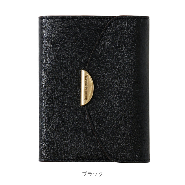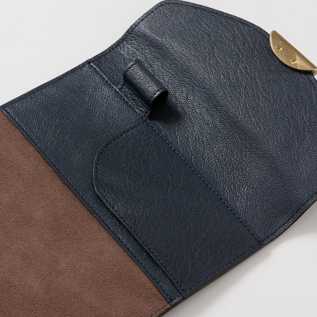 ブランドネームが入った真鍮金具のモチーフを採用。真鍮の重みを活かし、静かに閉じるフラップとなります。※マグネットではございません。