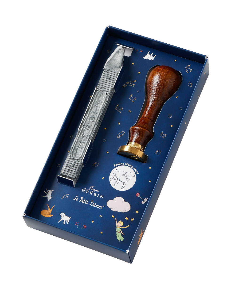 夜空を思わせる青いボックスに、星のように輝くシルバーのワックス。シープのスタンプを押すと、王子さまの小さなささやきが聞こえてくるようです。