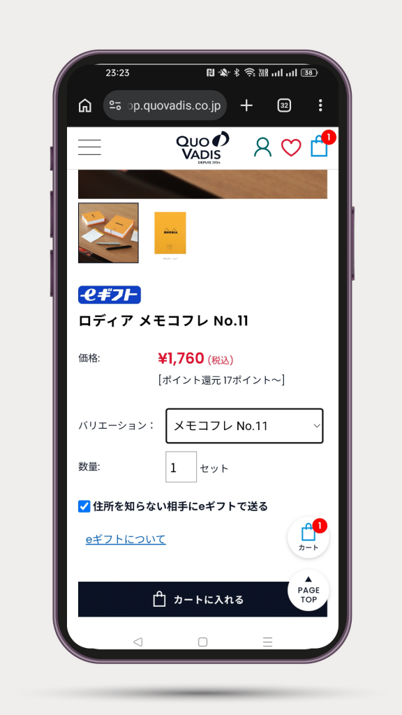1.商品ページでバリエーションを選択し、「住所を知らない相手にeギフトで送る」にチェックを入れカートに入れます。