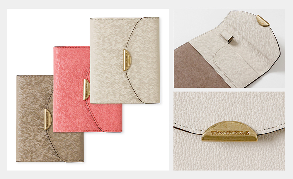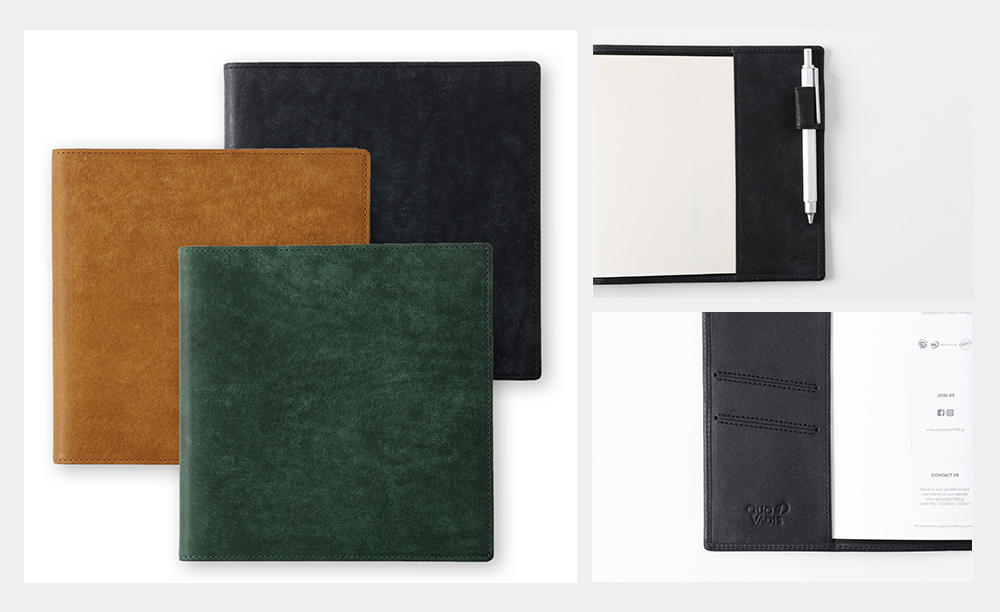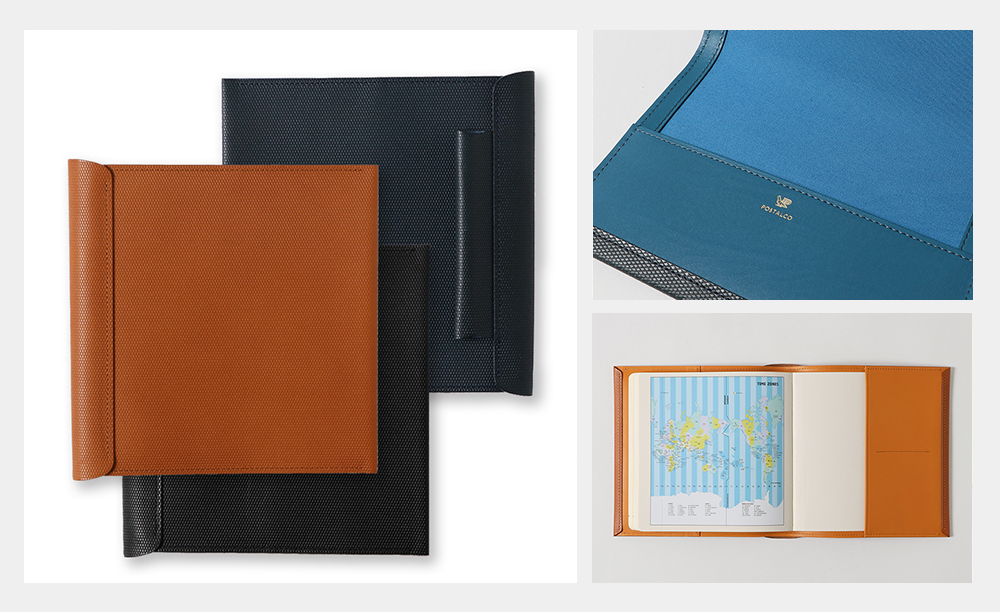 立体的な表情が魅力の軽量で丈夫な山羊(ゴート)革を使用し、カバーの内側はスエード調で上品な光沢と柔らかい肌ざわりが特徴です。