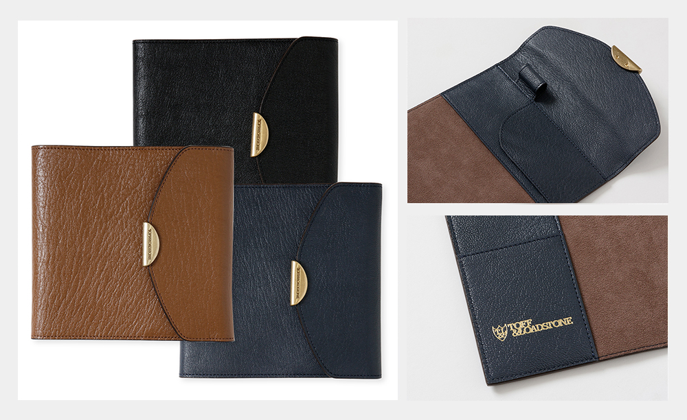 ペン差しと名刺などの収納に便利なオープンポケット、そして収まりのよいフラップ型の留め具など、日常遣いに寄り添った機能性のある仕様です。